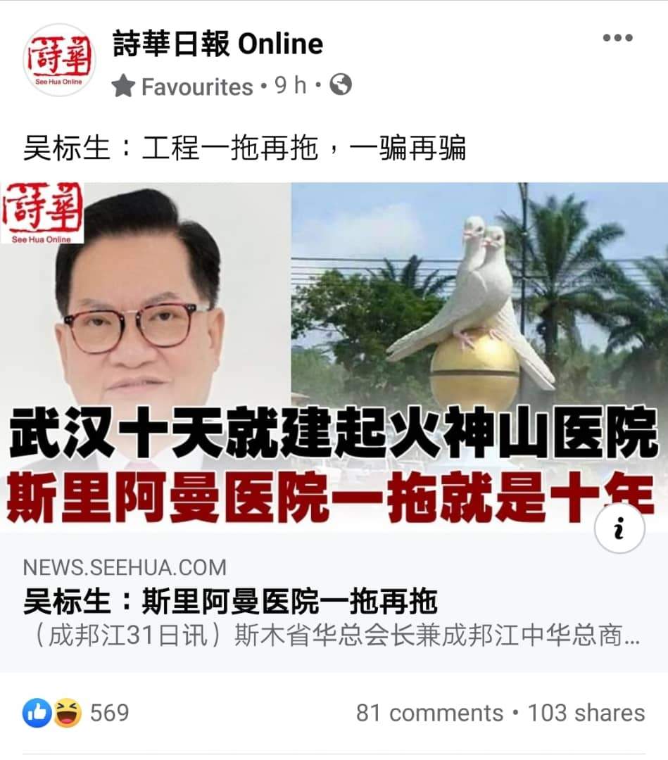 中国去年在武汉的一片荒地上,从开始设计到建成完工,只用短短十天,建起了总建筑面积3.39万平方米,可容纳1000张床位的火神山医院,可是令人感到惭愧,愤怒与不满的是斯里阿曼民众引颈长盼的只有108個病床、18間員工宿舍及緊急病房、停尸間、藥劑部等,耗资1亿8千万令吉的斯里阿曼新医院,自前首相纳吉宣布建院至今刚刚好10“周年纪念”之际,新医院工程一拖再拖,一骗再骗,竣工和启用日期却依然遥遥无期,已经沦为国际笑柄!