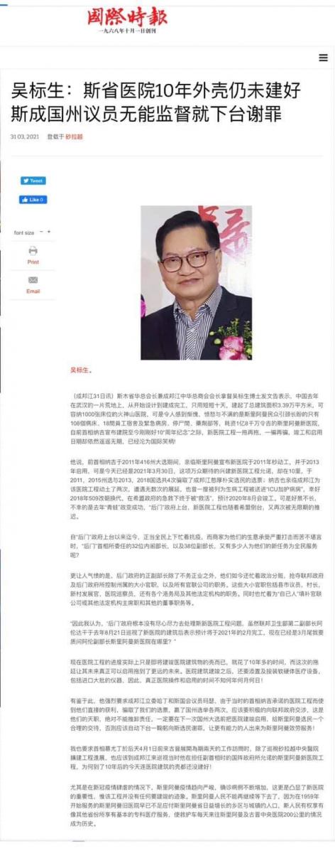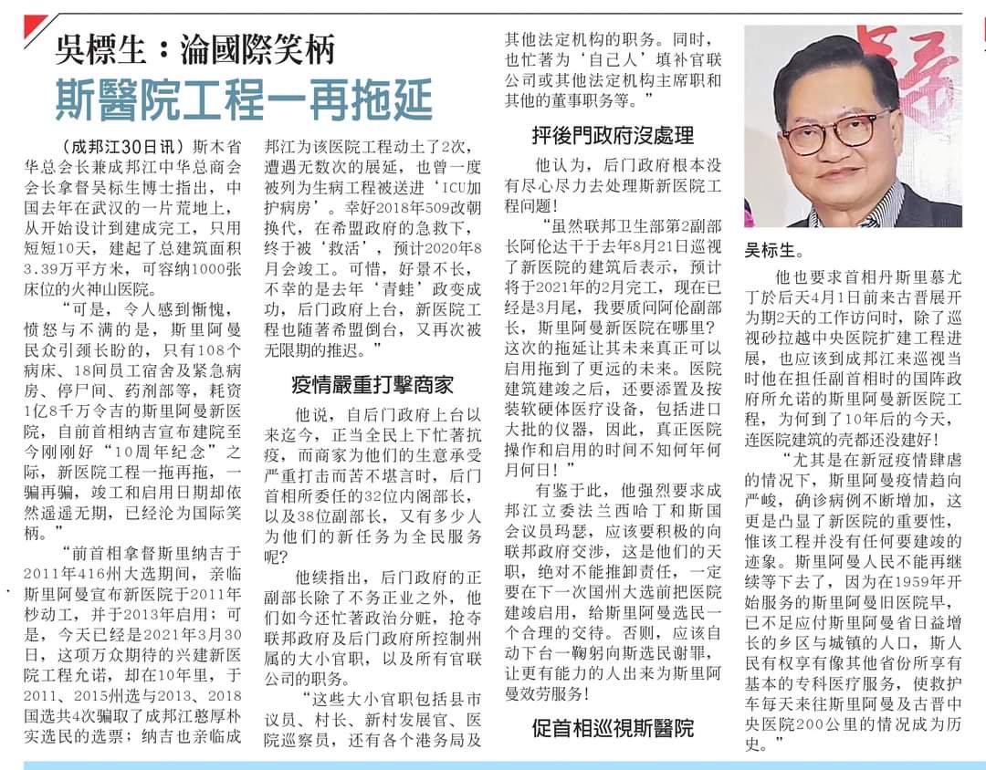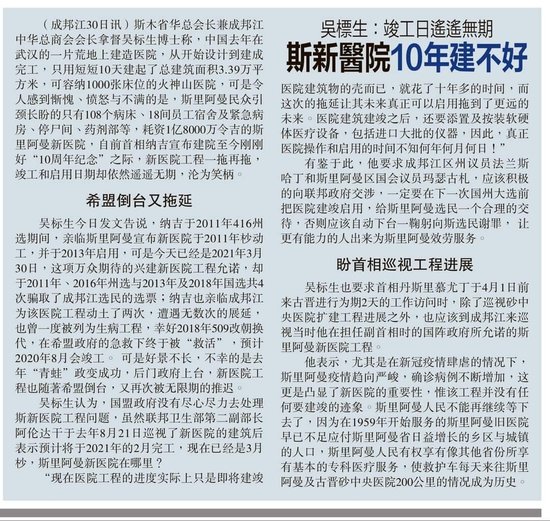 30/03/21 拿督吴标生:斯新医院10年建不好