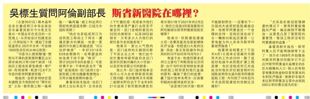 因此我认为,后门政府根本没有尽心尽力去处理斯新医院工程问题,虽然联邦卫生部第二副部长阿伦达干于去年8月21日巡视了新医院的建筑后表示预计将于2021年的2月完工,现在已经是3月尾我要质问阿伦副部长斯里阿曼新医院在哪里?