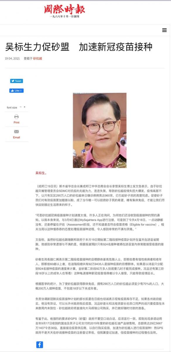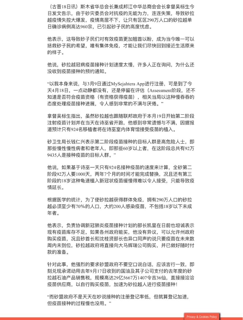 有鉴于此,我强烈的要求砂GPS政府不要空口说白话,应该言行一致,即刻兑现承诺动用去年9月17日收到的国油及其子公司支付的2019年度的砂拉越石油产品销售税,总额高达29亿5667万1407令吉36仙,直接接洽疫苗供应商,以自行购买疫苗,加速为砂拉越人进行疫苗接种!而GPS政府不是天天在吵说接种疫苗的注册登记率低,但就算登记加速,但疫苗接种的过程慢也没用。