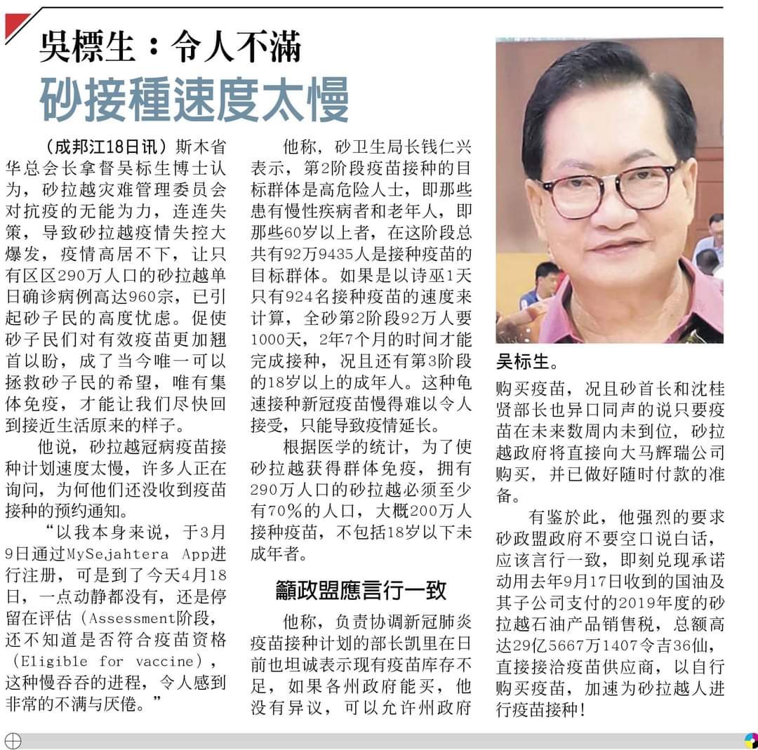 砂衛生局長錢仁興表示第二階段疫苗接种的目標群体是高危險人士,即那些患有慢性疾病者和老年人,即那些60歲以上者,在這階段總共有92万9435人是接种疫苗的目標群体。如果是以诗巫只分配到924名接种疫苗的速度来计算,全砂第二阶段92万多人到底要几时才能完成接种。况且还有第三阶段18岁以上的成年人在等着!这种龟速接种新冠疫苗慢得难以令人接受,只能导致疫情延长。