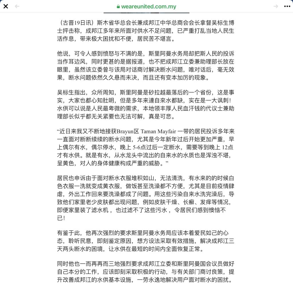 有鉴于此,我再次强烈的要求斯里阿曼水务局应该本着爱民如己的心态,聆听民意,即刻鉴定原因,想方设法采取有效措施,解决成邦江三天两头断水的困境,让水供在最短的时间内全面恢复正常。