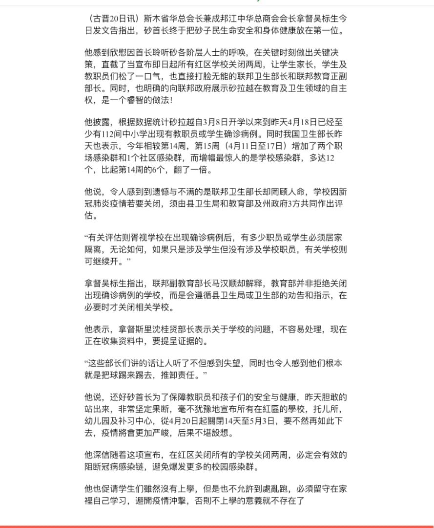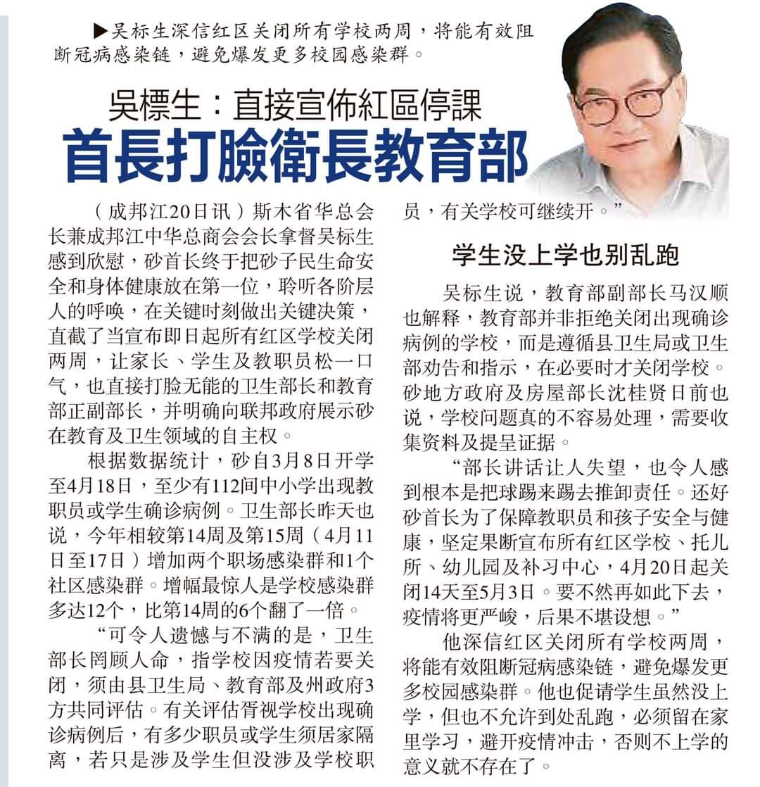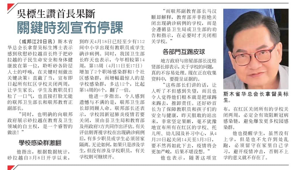 这些部长们讲的话让人听了不但感到失望,同时也令人感到他们根本就是把球踢来踢去,推卸责任。还好砂首长为了保障教职员和孩子们的安全与健康,昨天胆敢的站出来,非常坚定果断,毫不犹豫地宣布所有在紅區的學校,托儿所,幼儿园及补习中心,從4月20日起關閉14天至5月3日,要不然再如此下去,疫情將會更加严峻,后果不堪設想。
