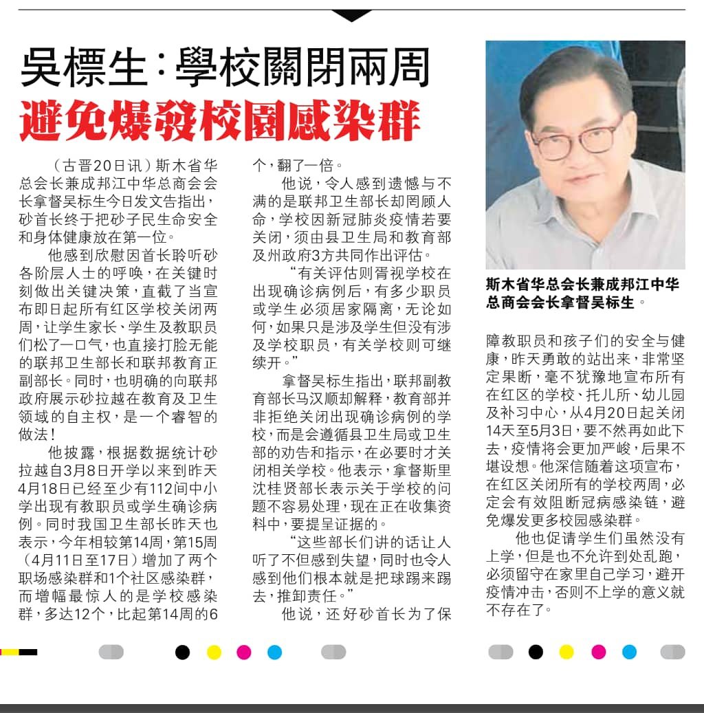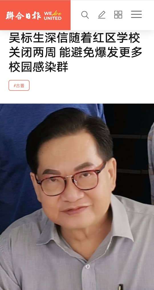 我深信随着这项宣布,在红区关闭所有的学校关闭两周,必定会有效的阻断冠病感染链,避免爆发更多的校园感染群。我也促请学生们雖然沒有上學,但是也不允許到處亂跑,必須留守在家裡自己学习,避開疫情沖擊,否則不上學的意義就不存在了。