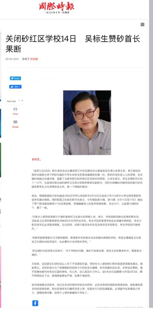 我感到欣慰砂拉越首长终于把砂拉越的子民生命安全和身体健康放在第一位,聆听砂各阶层人士的呼唤,在关键时刻做出关键决策,直截了当宣布即日起所有红区学校关闭两周,让学生家长,学生及教职员们松了一口气,也直接打脸无能的联邦卫生部长和联邦教育正副部长,同时也明确的向联邦政府展示砂拉越在教育及卫生领域的自主权,是一个睿智的做法!
