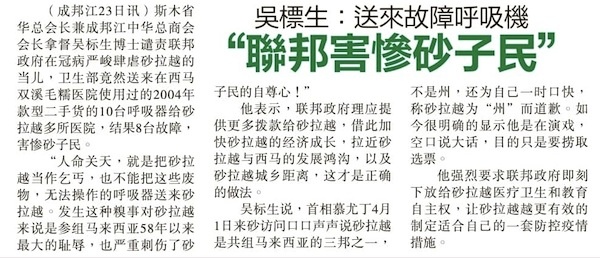 我要质问后门政府到底把砂拉越当作什么?人命关天,就是把砂拉越当作乞丐,也不能把这些废物,无法操作損壞的呼吸器送来砂拉越。难道后门政府真的还是抱着砂来越人住在树上的心态,无理的对待砂子民吗?发生这种丑闻糗事对砂拉越来说是参组马来西亚58年以来最大的耻辱,也严重刺伤了砂子民的自尊心!