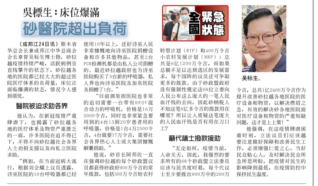 虽然医疗卫生是联邦政府的管辖权,可是令人感到愤怒的是后门政府却对砂不理不睬,更甚的是还把二手故障呼吸机送来砂拉作为医治冠病的仪器,彻底的看扁造王者的砂拉越。