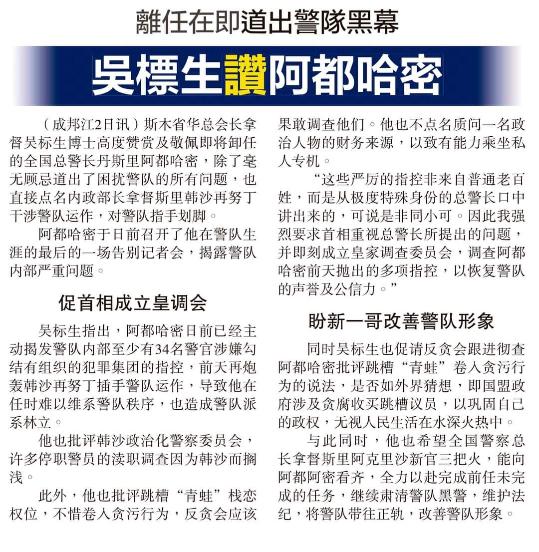 阿都哈密日前已经主动揭发警队内部至少有34名警官涉嫌勾结有组织的犯罪集团的指控,前天却变本加厉,炮轰韩沙插手警队运作,导致他在任时难以维系警队秩序,也造成警队派系林立。