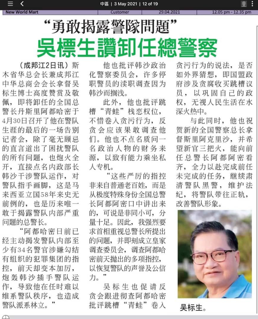 我高度的赞赏及非常的敬佩 即将卸任的全国总警长丹斯里阿都哈密于前天4月30日召开了他在警队生涯的最后的一场告别记者会,除了毫无顾忌的直言道出了困扰警队的所有问题,也炮火全开直接点名内政部长韩沙干涉警队运作,对警队指手画脚。这是马来西亚立国58年来史无前例的,也是历来唯一敢于揭露警队内部严重问题的总警长。