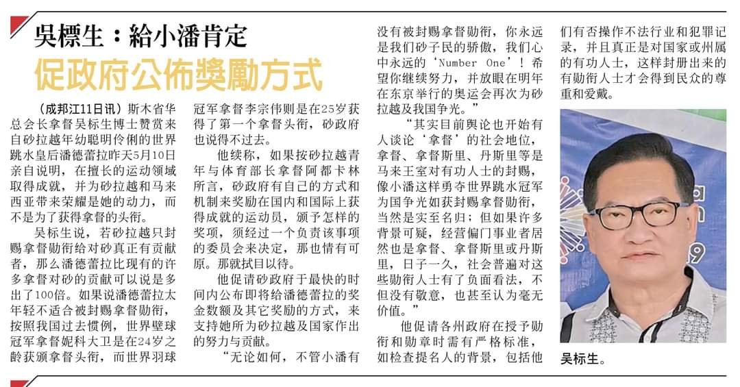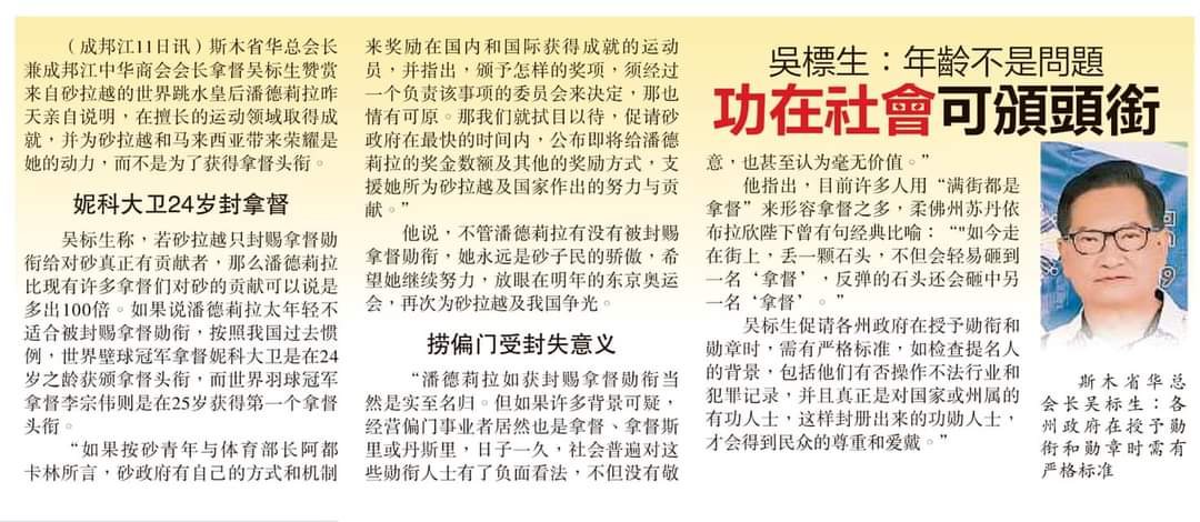 其实目前舆论也开始有人谈论“拿督”的社会地位,拿督,拿督斯里,丹斯里等是马来王室对有功人士的封赐,像小潘这样勇夺世界跳水冠军为国争光如获封赐拿督勋衔,当然是实至名归;但如果许多背景可疑,经营偏门事业者居然也是拿督,拿督斯里或丹斯里,日子一久,社会普遍对这些勋衔人士有了负面看法,不但没有敬意,也甚至认为毫无价值。