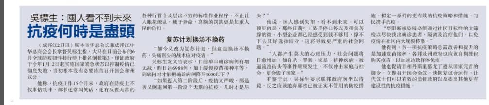 有鉴于此,我强烈的要求联邦政府勿坐以待毙,反之应该抛弃那些已被证实不管用的防疫措施,拟定一系列的更有效的抗疫策略和措施,与民携手抗疫。