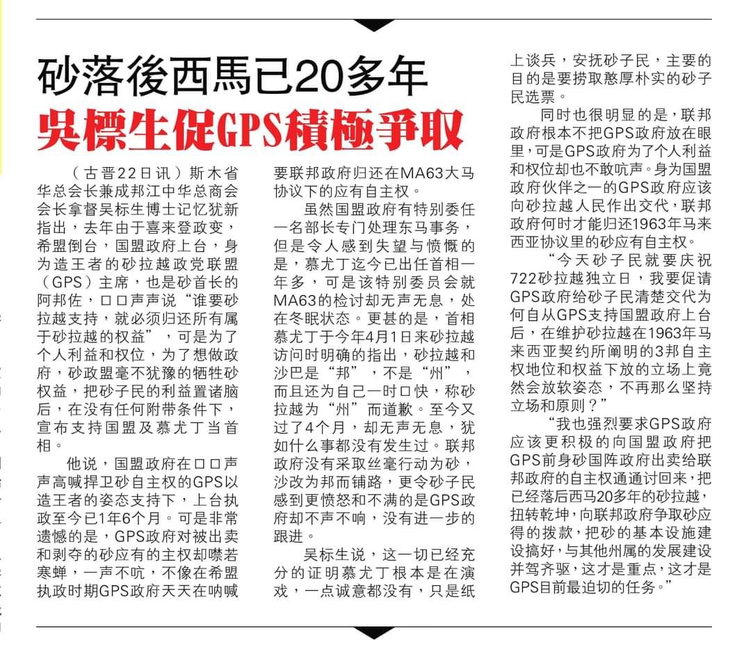 国盟政府在口口声声高喊捍卫砂自主权 的GPS以造王者的姿态支持下,上台执政至今已1年6个月可是非常遗憾的是,GPS政府对被出卖和剥夺的砂应有的主权却噤若寒蝉,一声不吭,不像在希盟执政时期GPS政府天天在呐喊要联邦政府归还在MA63大马协议下的应有自主权。