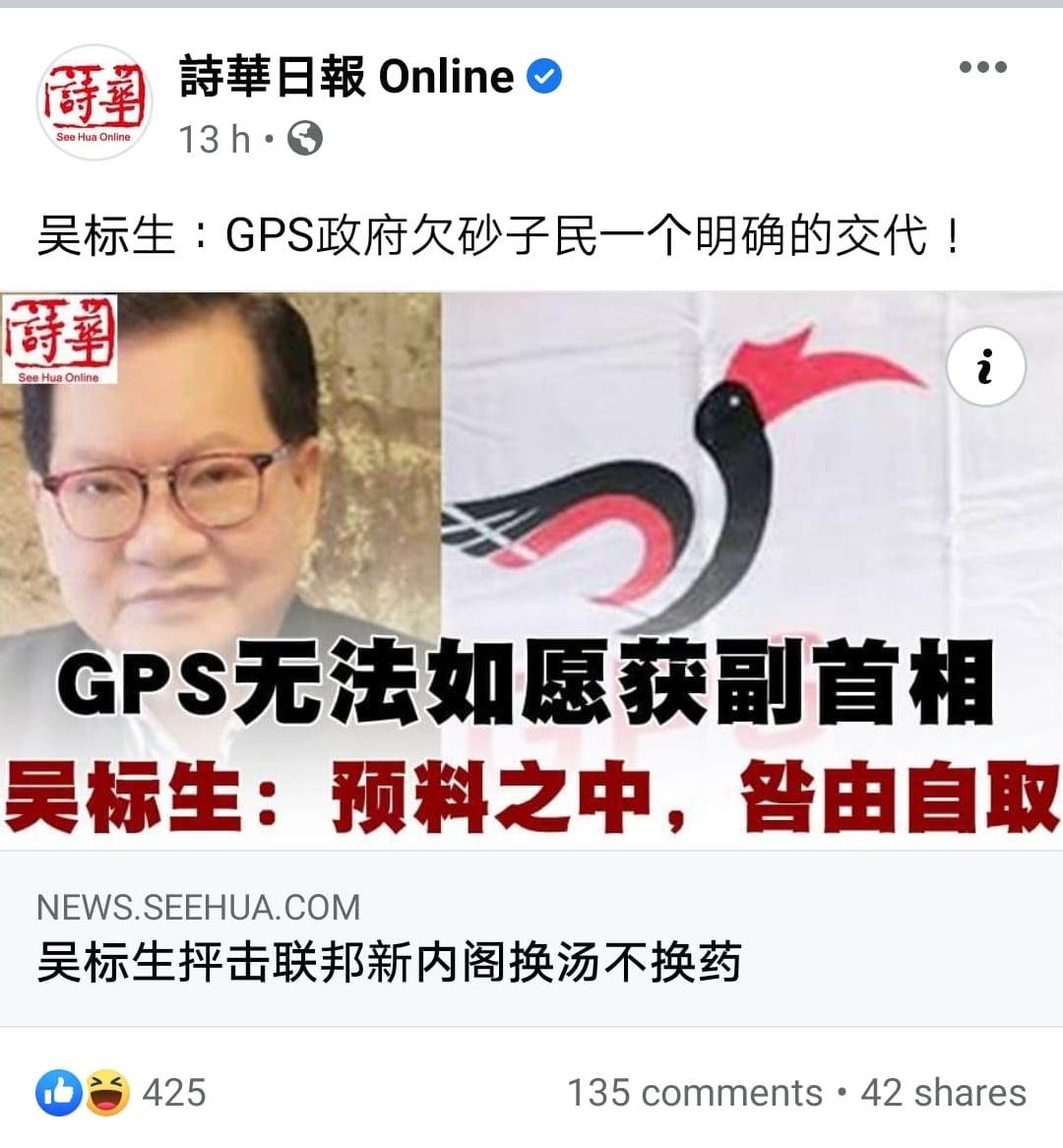砂子民感到心寒看到GPS政府不做造王者,宁愿等到新首相出炉,米已成饭后,向新首相“乞讨”冀联邦珍惜付出给机会砂政党领袖任副首相,之后GPS也建议,新首相将乡区发展部长职位,交由东马代表担任。令砂子民感叹的是,一切已经太迟了,在今天出炉的内阁中,砂拉越只获得保留原有的部长职位,也没有索回在MA63协议下所有原屬于砂拉越的權益地位,GPS政府欠砂子民一个明确的交代!