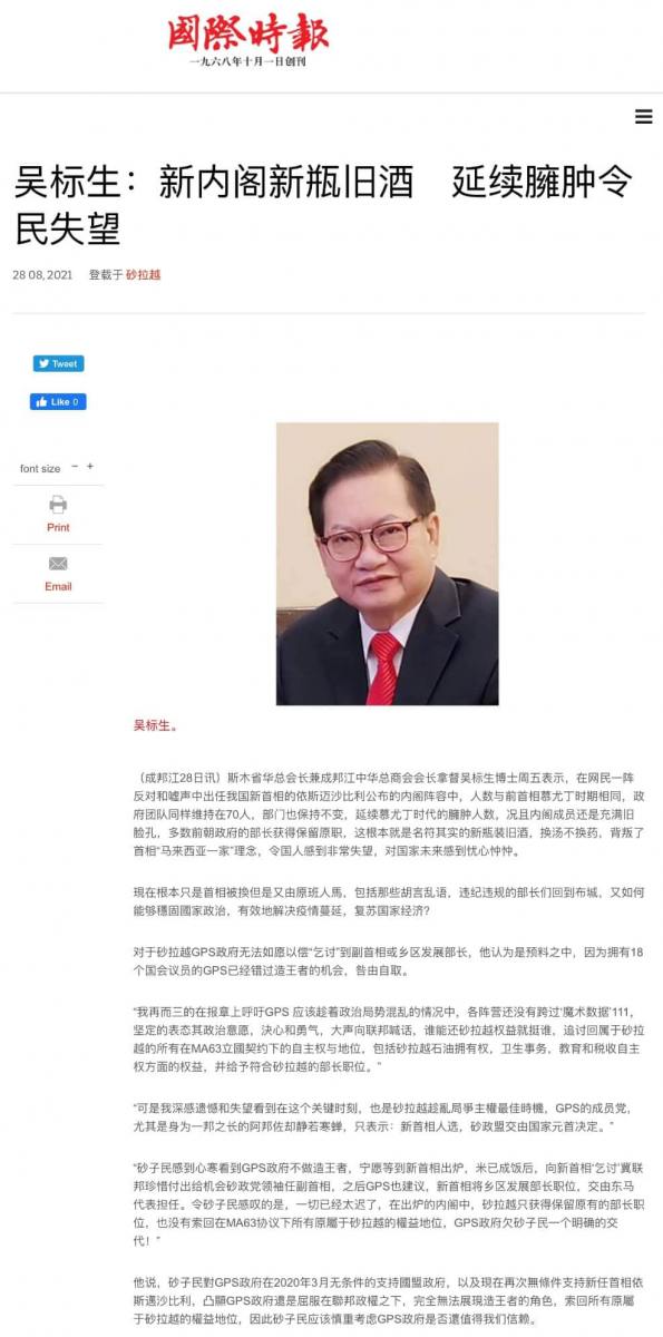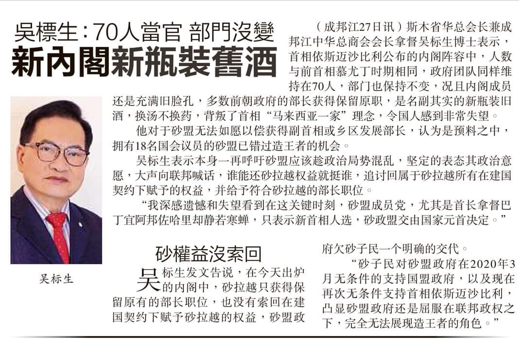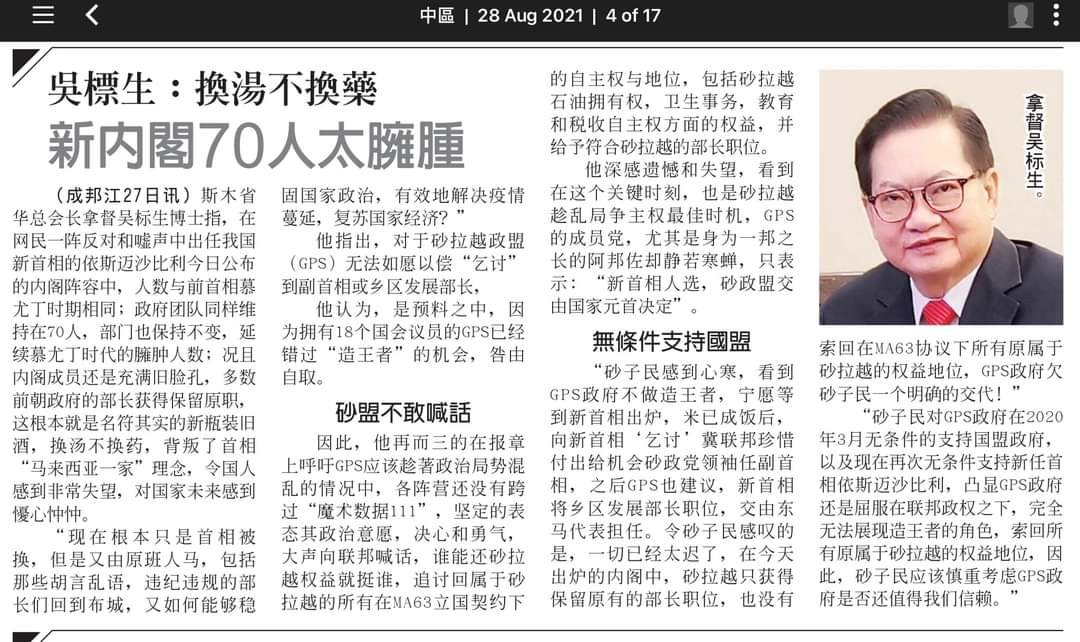 27/08/21 拿督吴标生:新内阁70人太臃肿