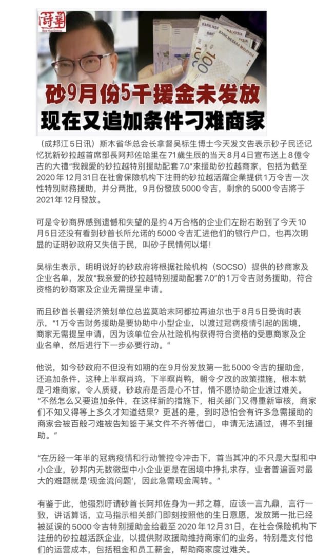 如今砂政府不但没有如期的在9月份发放第一批5000令吉的援助金,還追加條件,这种上半暝肖雞,下半暝肖鴨,朝令夕改的政策措施根本就是刁难商家,令人质疑砂政府是否是心不甘情不愿协助企业渡过难关。不然怎么又要追加條件,在这样新的措施下,相关部门又得重新審核,商家們不知又得等上多久才知道結果?更甚的是到时恐怕会有许多急需援助的商家會被百般刁难被告知鑒于某文件不齊等借口,申請無法通過,得不到援助。