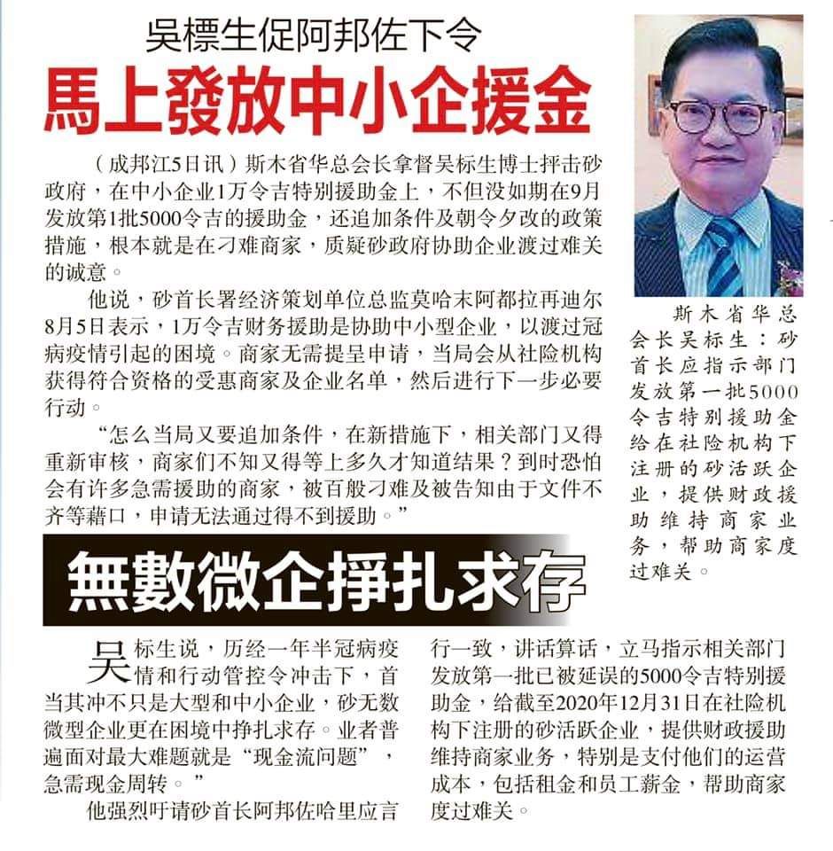 有鉴于此我强烈的吁请砂首长阿邦佐身为一邦之尊,应该一言九鼎,言行一致,讲话算话,立马指示相关部门即刻按照他的生日意愿,发放第一批已经被延误的5000令吉特别援助金给截至2020年12月31日在社會保險机构下注冊的砂拉越活躍企業,以提供財政援助維持商家們的業務,特別是支付他們的運營成本,包括租金和員工薪金,幫助商家度過難關。