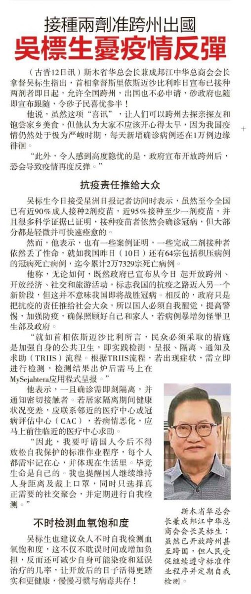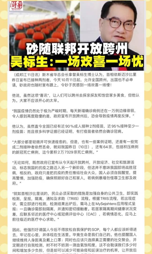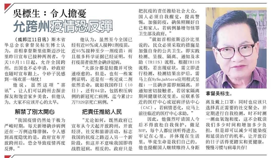 11/10/21 拿督吴标生:允跨州疫情恐反弹