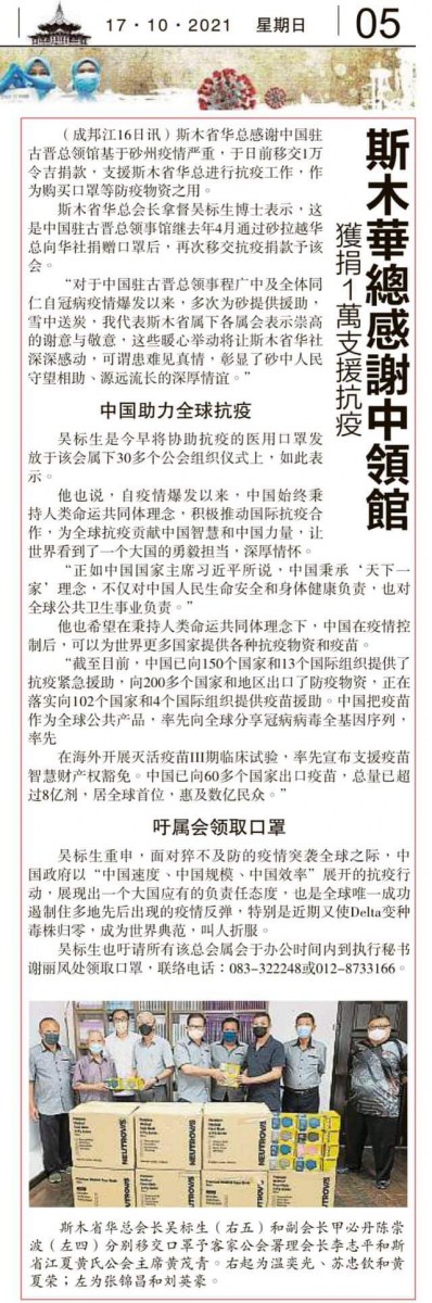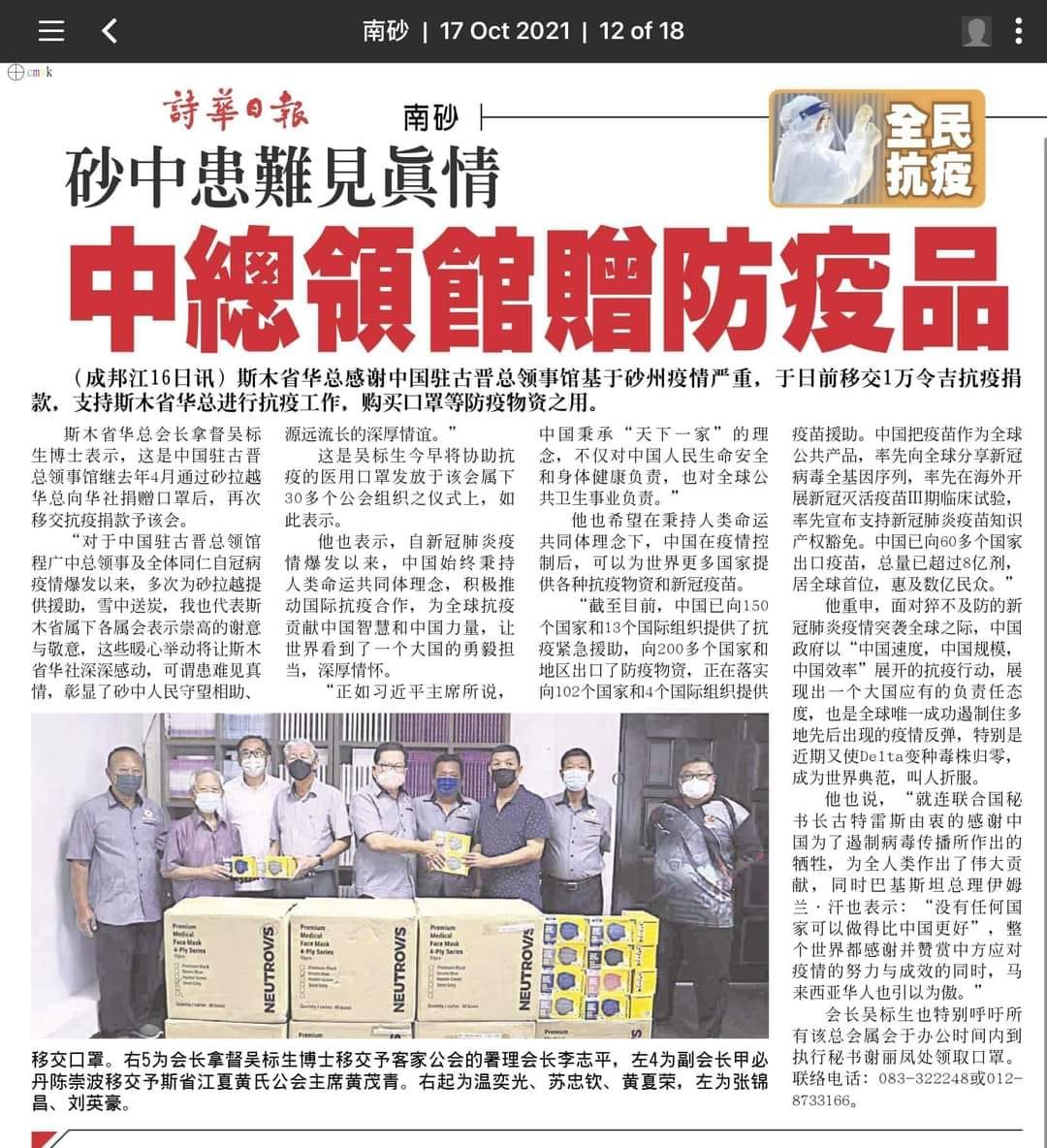“对于中国驻古晋总领馆程广中总领事及全体同仁自冠病疫情爆发以来,多次为砂拉越提供援助,雪中送炭,我也代表斯木省属下各属会表示崇高的谢意与敬意,这些暖心举动将让斯木省华社深深感动,可谓患难见真情,彰显了砂中人民守望相助、源远流长的深厚情谊。”