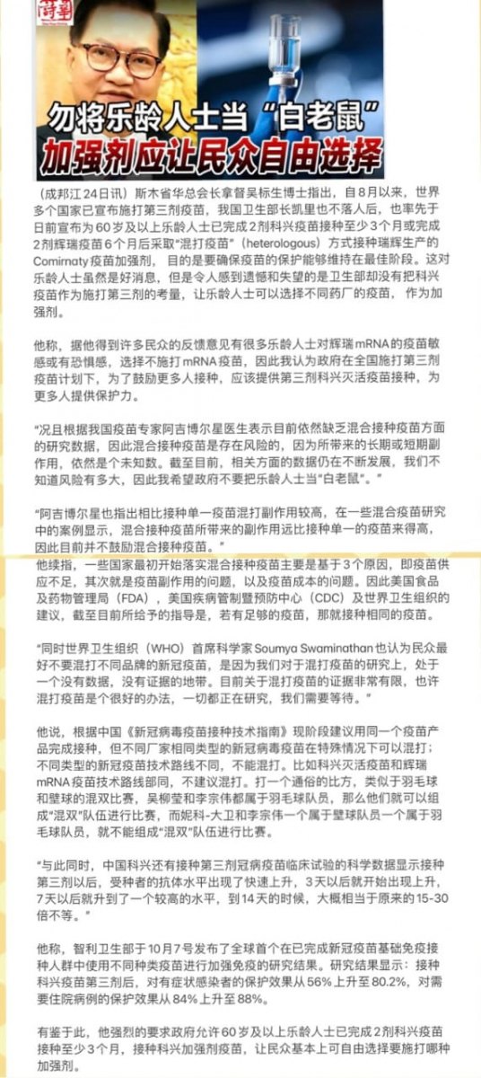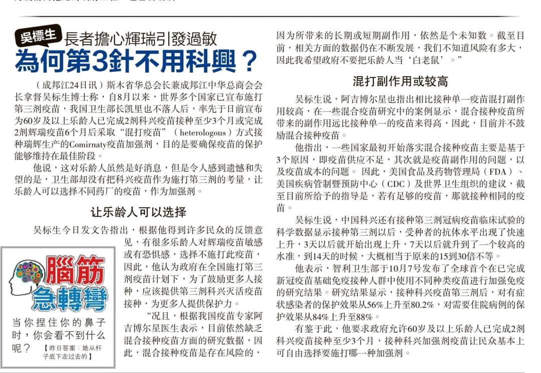 24/10/21 拿督吴标生:为何第3针不用科兴?