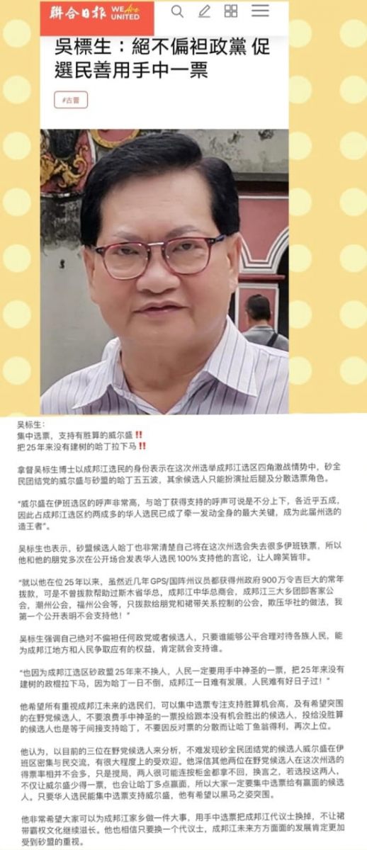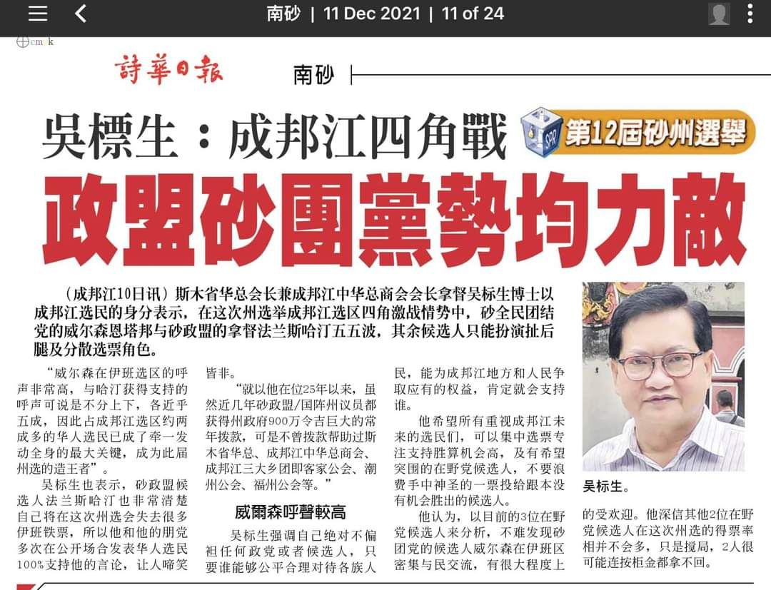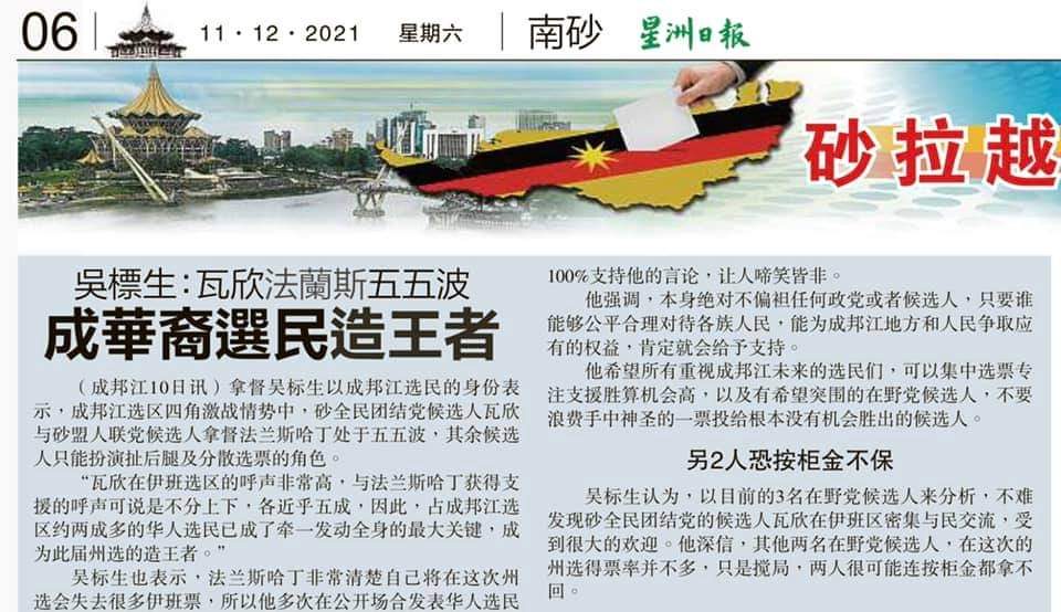 吴标生也表示,砂盟候选人哈丁也非常清楚自己将在这次州选会失去很多伊班铁票,所以他和他的朋党多次在公开场合发表华人选民100%支持他的言论,让人啼笑皆非。