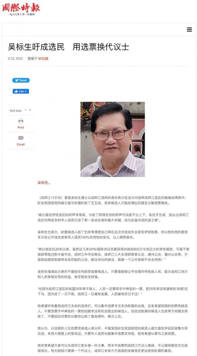 吴标生强调自己绝对不偏袒任何政党或者候选人,只要谁能够公平合理对待各族人民,能为成邦江地方和人民争取应有的权益,肯定就会支持谁。