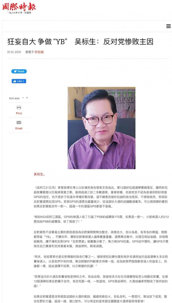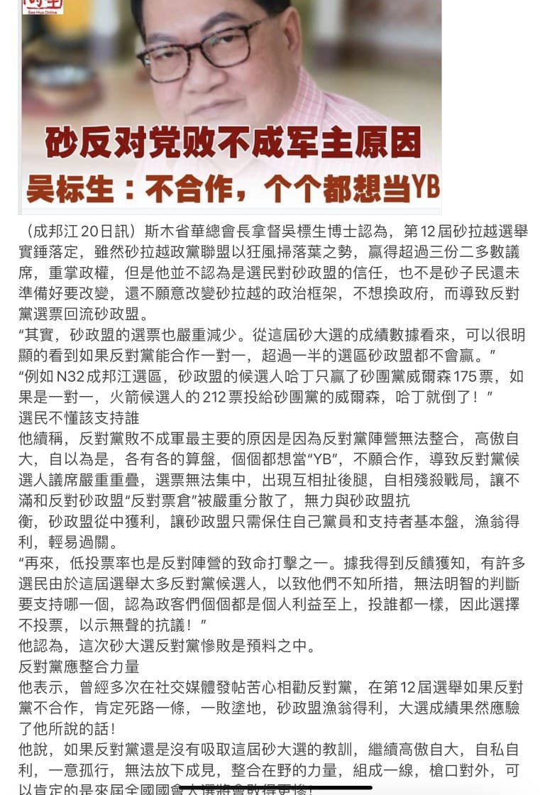 其實這次砂大選反對黨慘敗是預料之中,我曾經多次在社交媒體發帖苦心相勸反對黨,在第12屆選舉如果反對黨不合作,肯定死路一條,一敗塗地,GPS漁翁得利,大選成績果然驗收了我所說的話!