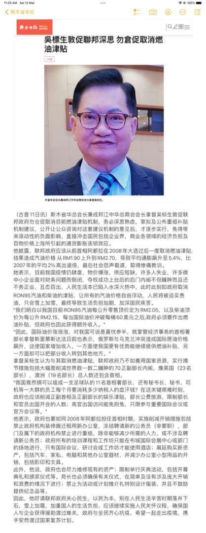 針對財政部長扎夫魯昨天在國會下議院表示,隨著國際原油價格上漲,政府在2022年1月支付的補貼,已超過了20億令吉,相比2021年1月份的2億令吉,增加了10倍;因此,政府將檢討,以及會更針對性地來落實燃油補貼機制,我要敦促聯邦政府勿倉促取消目前燃油津貼機制,務必深思熟慮,草擬及公佈重組補貼機制建議,公開讓公眾咨詢對這套建議機制的意見後,才逐步實行,免得帶來滾動性的負面影響,直接衝擊國民包括企業界,商業各領域的經濟負擔及百物價格上漲所引起的通貨膨脹連鎖效應。