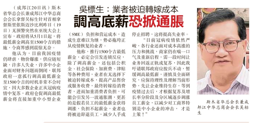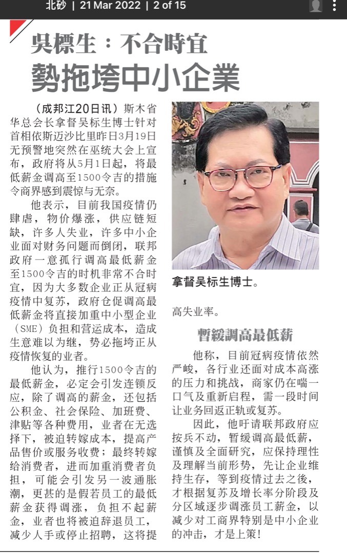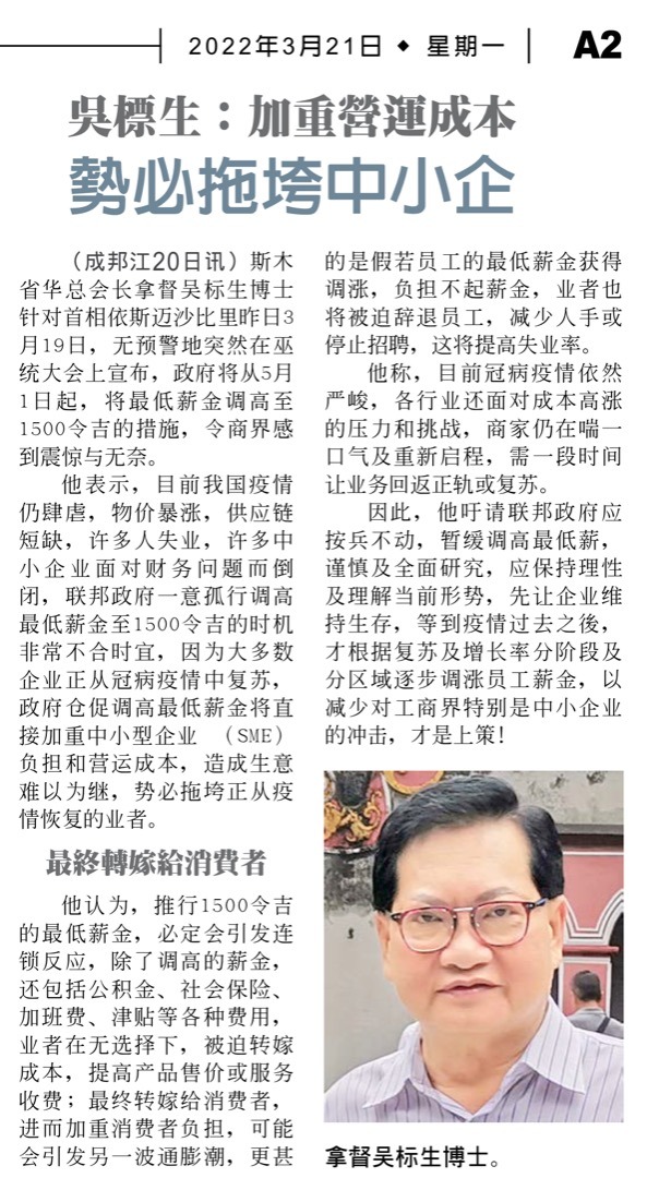 20/03/22 拿督吴标生:调薪拖垮中小企