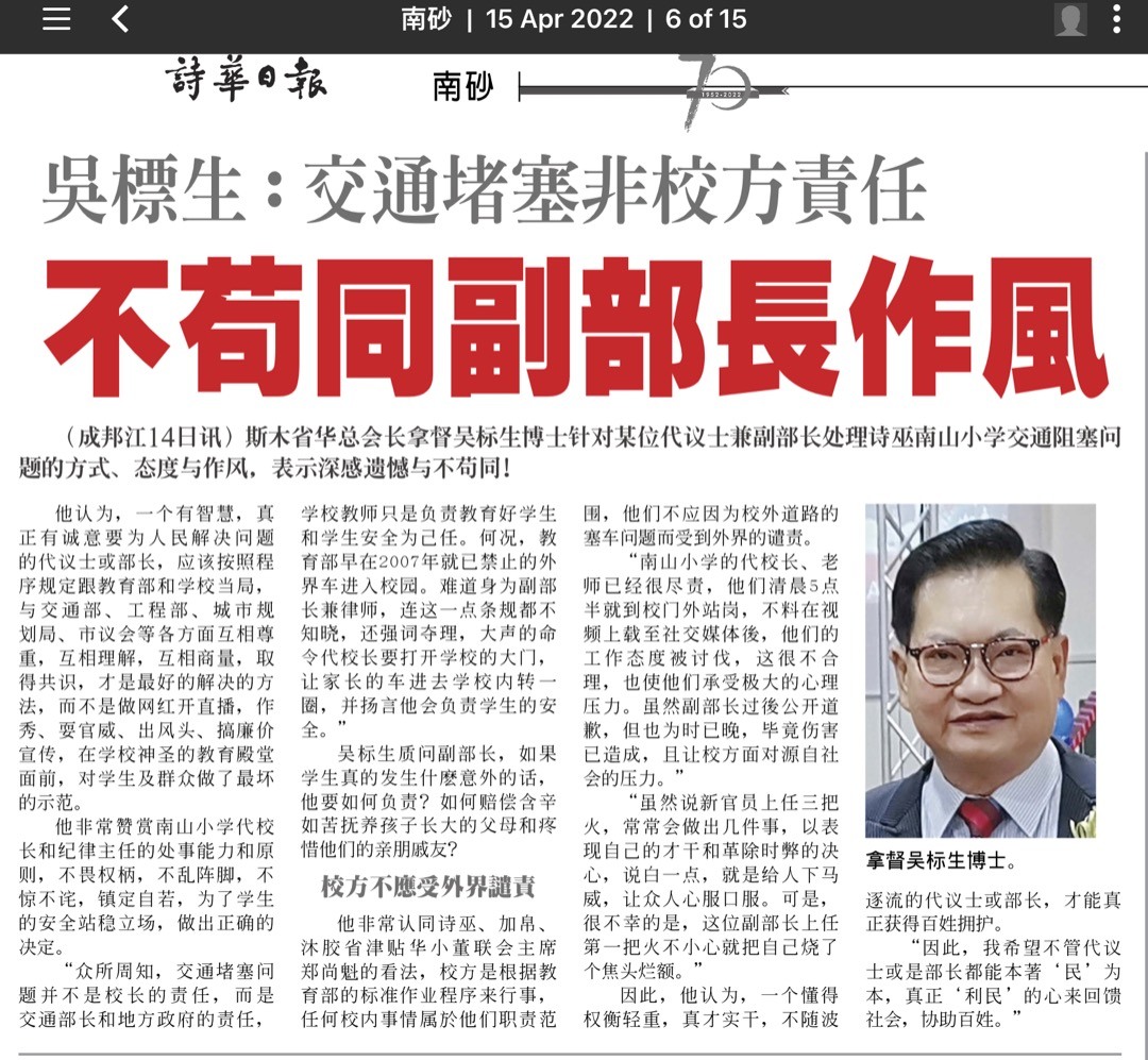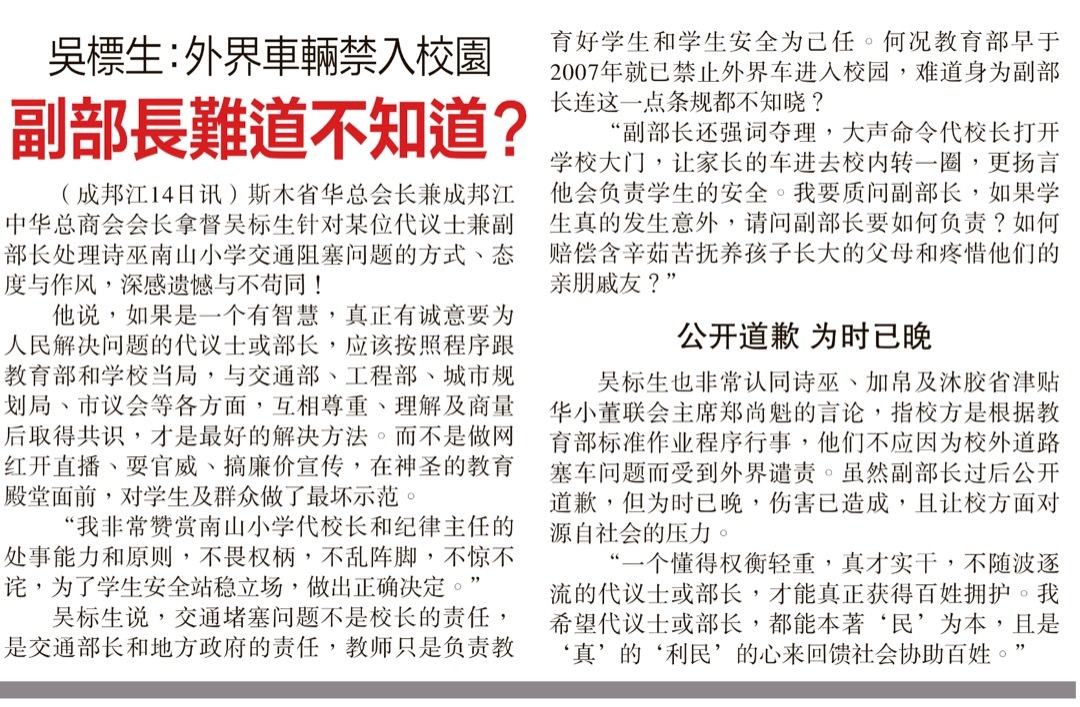 針對某位代議士兼副部長處理詩巫南山小學交通阻塞問題的方式,態度與作風,我深感遺憾與不苟同!