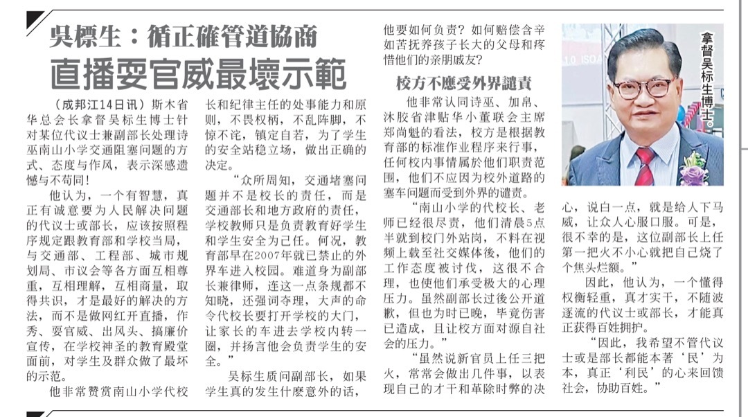 我非常的贊賞南山小學的代校長和紀律主任的處事能力和原則,不畏權柄,不亂陣腳,不驚不詫,鎮定自若,為了學生的安全站穩立場,做出正確的決定。眾所周知,交通堵塞問題並不是校長的責任,而是交通部長和地方政府的責任,學校教師只是負責教育好學生和學生安全為己任。何況教育部早在2007年就已禁止的外界車進入校園,難道身為副部長兼律師連這一點條規都不知曉。還強詞奪理,大聲的命令代校長要打開學校的大門讓家長的車進去學校內轉一圈,並揚言他會負責學生的安全。我要質問副部長如果學生真的發生什麼意外的話,請問你要如何負責? 如何賠償含辛如苦撫養孩子長大的父母和疼惜他們的親朋戚友?