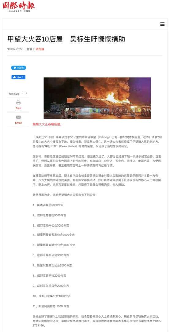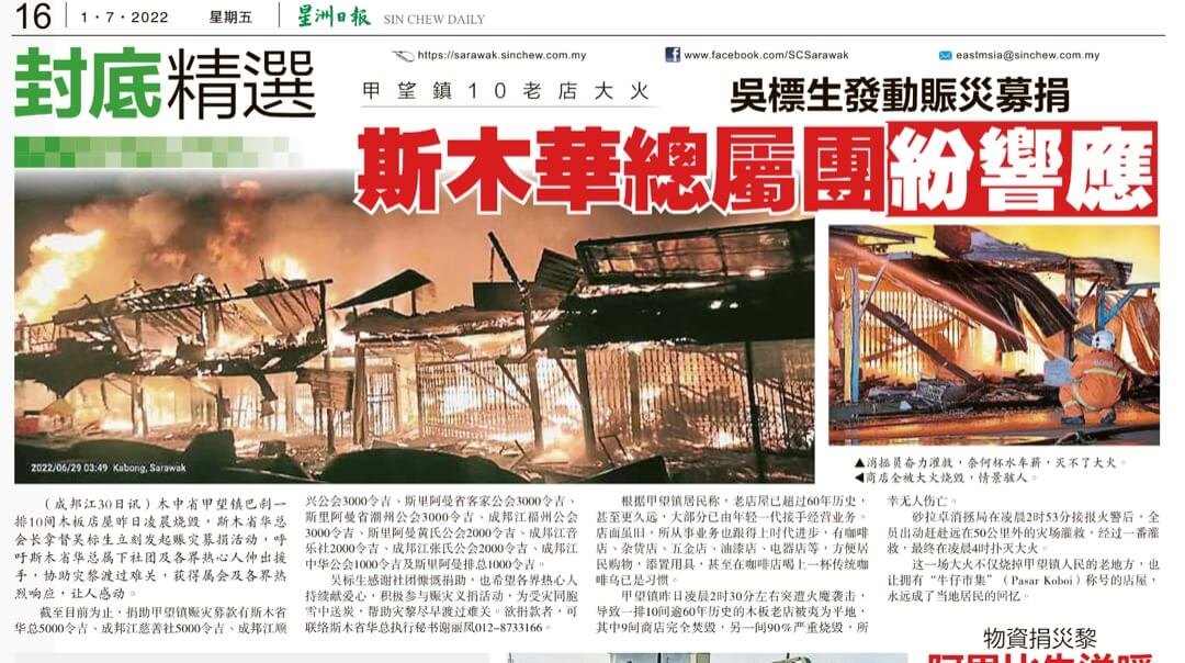 在獲悉这场不幸事故后,斯木省华总会长拿督吴标生博士对受火灾影响的灾黎表示慰问并本着一方有难,八方支援的中华传统美德,发起赈灾募捐活动,呼吁斯木省华总属下社团以及各界热心人士伸出援手,献上关怀,协助灾黎度过难关,并取得了各属会积极响应,令人感动。