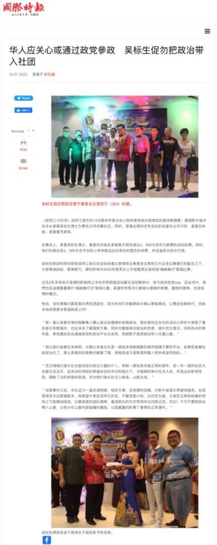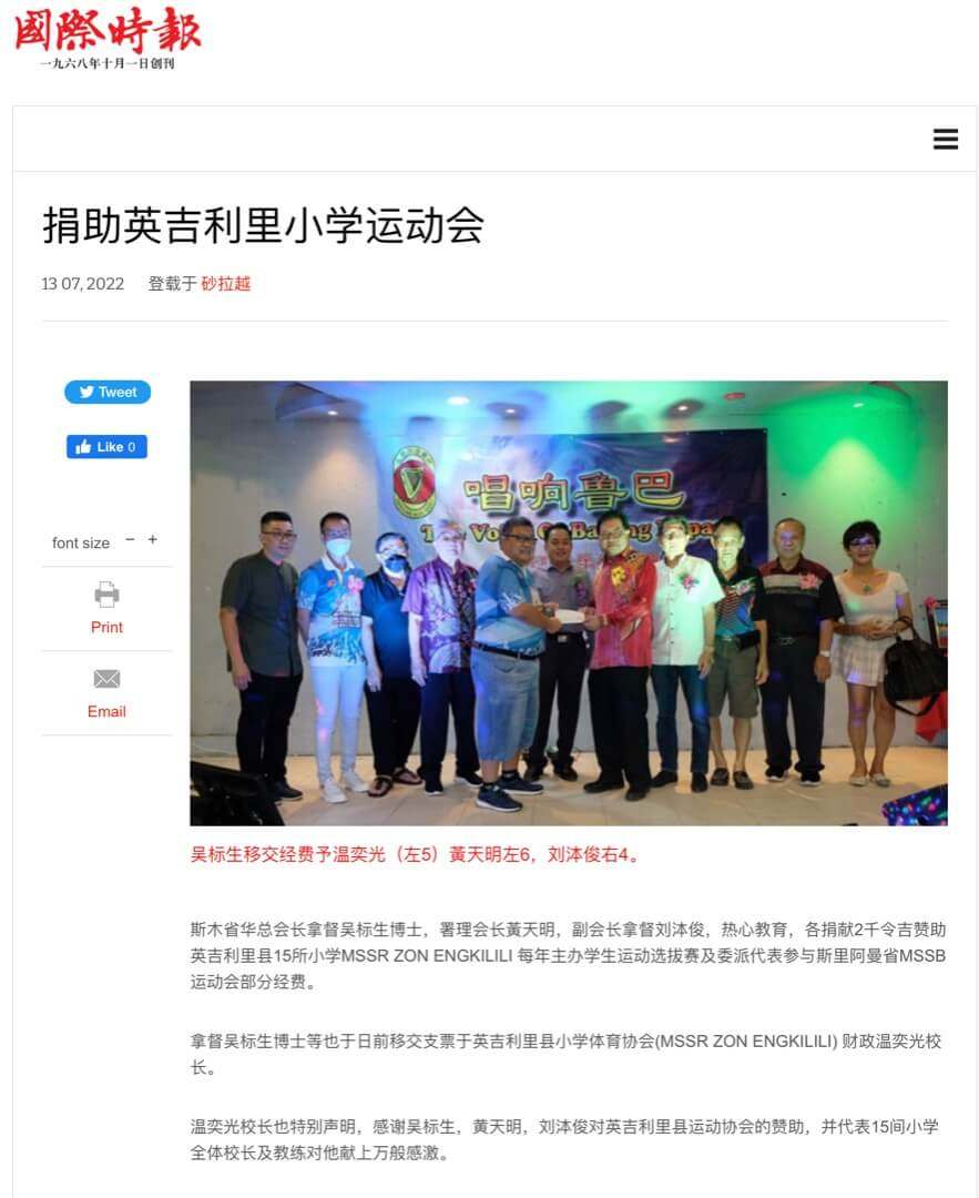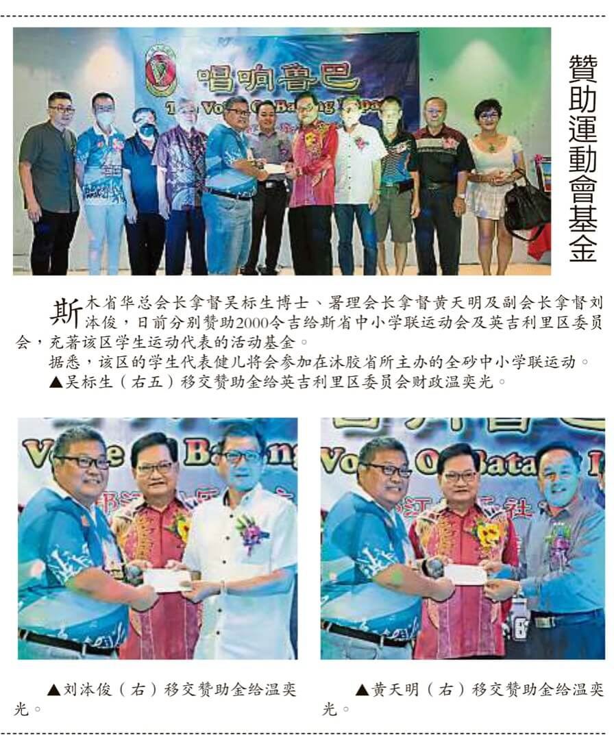 斯木省华总会长拿督吴标生博士,署理会长黃天明,副会长拿督刘泍俊,热心教育,各捐献2千令吉赞助英吉利里县15所小学MSSR ZON ENGKILILI 每年主办学生运动选拔赛及委派代表参与斯里阿曼省MSSB运动会部分经费。