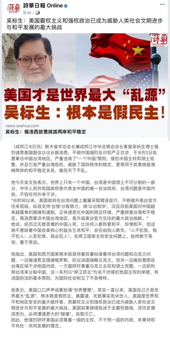 斯木省华总会长兼成邦江中华总商会会长拿督吴标生博士发表文告强烈谴责美国国会众议长佩洛西不顾中国强烈反对和严正交涉﹐于8月2日执意窜访中国台湾地区,严重违背了一个中国原则﹐ 侵犯中国主权和领土完整,并且引发严重台海危机﹐威胁了国际秩序的稳定,更等同于故意挑拨海峡两岸的和平稳定关系,唯恐天下不乱。