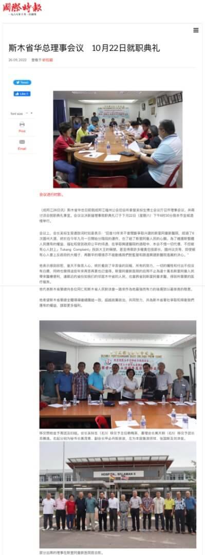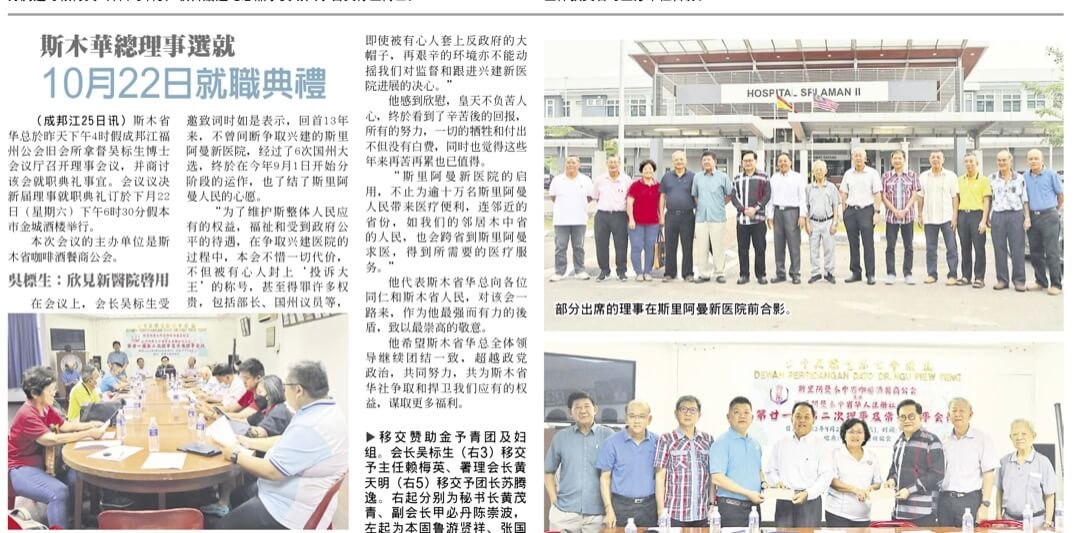 我們感到非常的欣慰,皇天不負苦人心,我們終於看到了辛苦後的回報,我們所有的努力,一切的犧牲和付出不但沒有白費,同時也覺得這些年來再苦再累也已值得。斯里阿曼新医院的启用不止為逾十萬名斯里阿曼人民帶來醫療便利,連鄰近的省份如我们的邻居木中省的人民,也會跨省到斯里阿曼求醫,得到所需要的医疗服务。在這裡我要代表斯木省華總向各位同仁和斯木省人民對本會一路來作為我最強而有力的後盾致以最崇高的敬意。