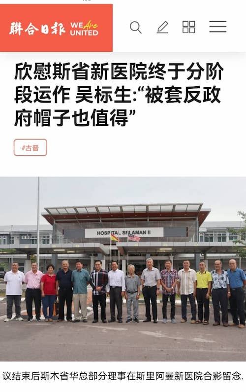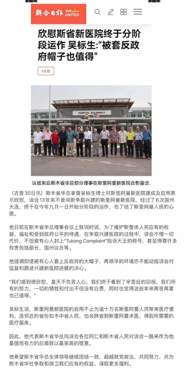 他日前在斯木省华总理事会议上致词时说,为了维护斯整体人民应有的权益,福祉和受到政府公平的待遇,在争取兴建医院的过程中,该会不惜一切代价,不但被有心人封上“Tukang Complaint”投诉大王的称号,甚至得罪许多权贵包括部长,国州议员等。