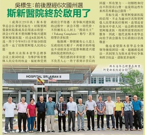 (古晋30日讯)斯木省华总拿督吴标生博士对斯里阿曼新医院建成及启用表示欣慰,该会13年来不曾间断争取兴建的斯里阿曼新医院,经过了6次国州大选,终于在今年九月一日开始分阶段的运作,也了结了斯里阿曼人民的心愿。