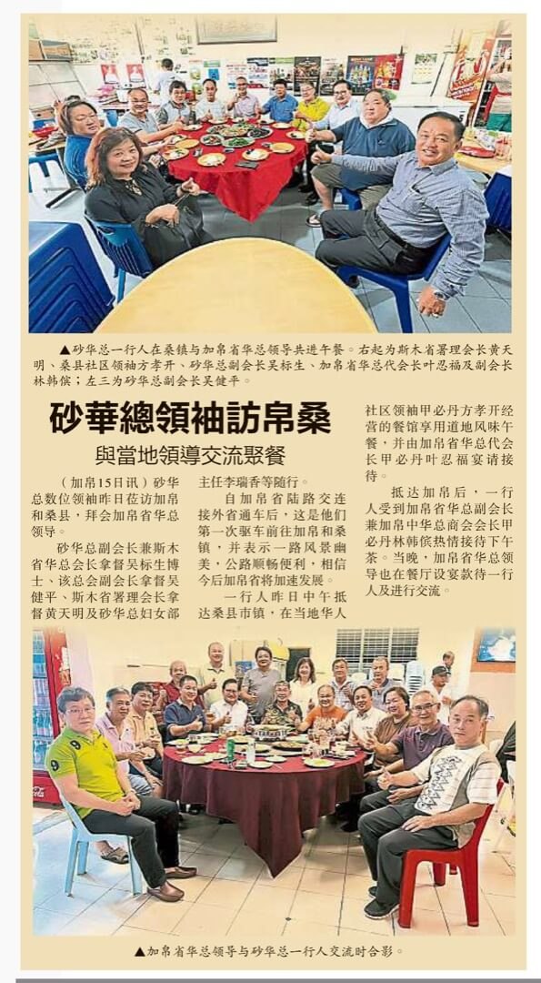 砂华总数位领袖昨日访加帛和桑县,拜会加帛省华总领导。 抵达加帛后 一行人受到加帛省华总副会长兼加帛中华总商会会长甲必丹林韩热情接待下午茶。当晚,加帛省华总领导也在餐厅设宴款待一行人及进行交流。 砂华总副会长兼斯木省华总会长拿督吴标生博士、该总会副会长拿督吴健平、斯木省署理会长拿督黄天明及砂华总妇女部主任李瑞香等随行。