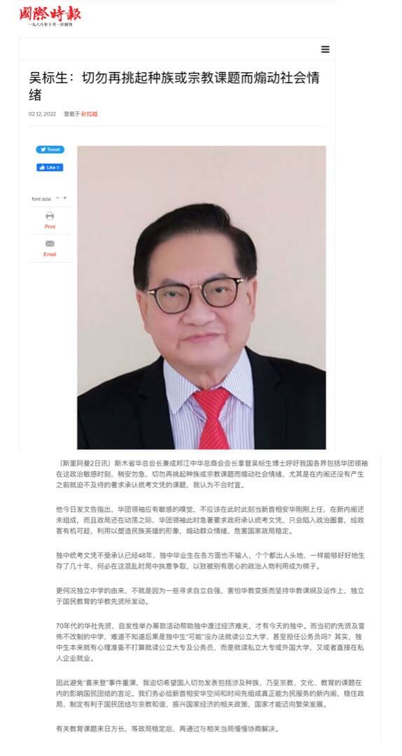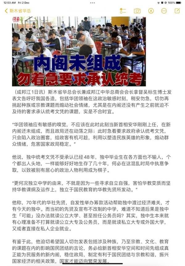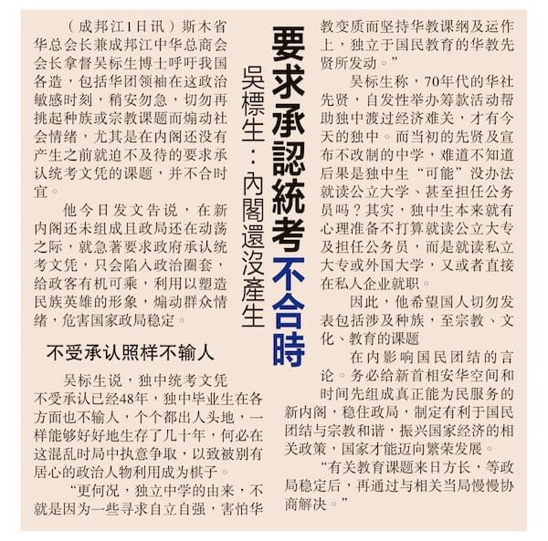 01/12/22 拿督吴标生:华社勿急要求承认统考