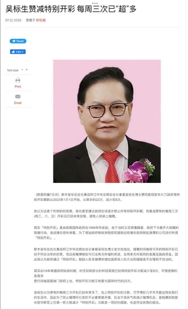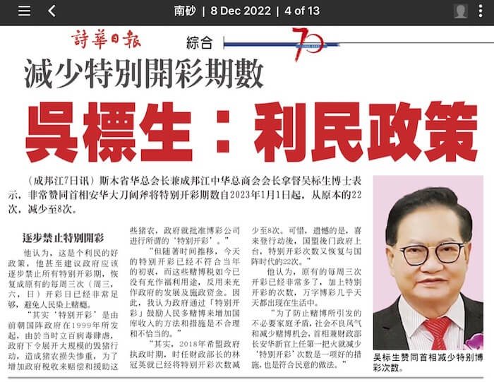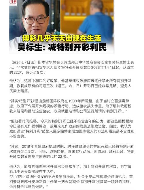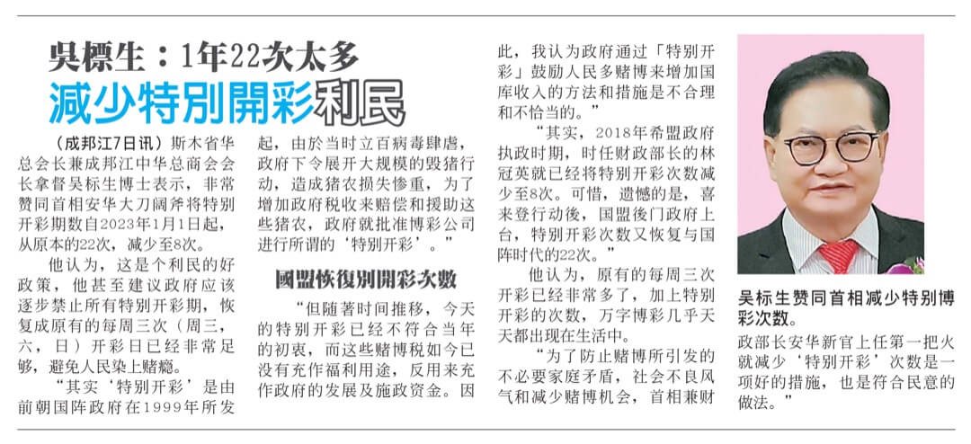 我非常贊同首相安華大刀闊斧將特別開彩期數從2023年1月1日開始,從原本的22次,減少至8次。我認為這是個利民的好政策,我也甚至建議政府應該逐步禁止所有特別開彩期,恢復成原有的每週三次(週三,六,日)開彩日已經非常足夠,避免人民染上賭癮。