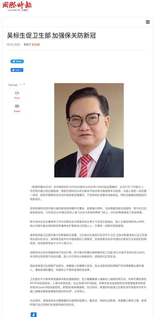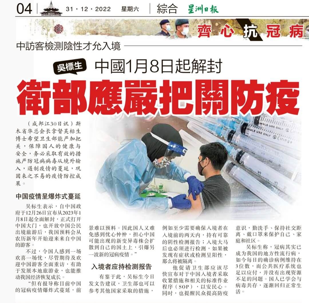 雖然我該副衛生部長魯卡尼斯曼前天透露,衛生部長扎麗哈已經召開與衛生 總監丹斯里諾希山及衛生部相關團隊的會議,很快就會宣佈對中國遊客的入境需求,包括將要求來自中國的訪客進行出發前的冠病檢測,檢測呈陰性後才允許入境大馬,但遺憾的是至今,我國衛生部尚未宣佈對入境中國旅客是否有特定防疫措施。