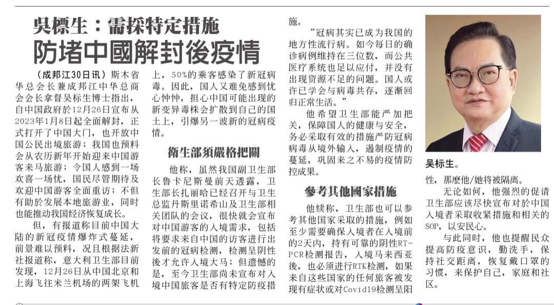自中國政府於12月26日宣佈從2023年1月8日起全面解封,正式打開了中國大門,也開放中國公民出境旅遊,我國也预料会從農歷新年开始迎来中國游客来馬旅遊,令國人感到一場歡喜一場憂,國民儘管期待及歡迎中國遊客全面重訪,不但有助於發展本地旅遊業,同時也能推動我國經濟恢復成長。但有報道稱目前中國大陸的新冠疫情爆炸式蔓延,前景難以預料,況且根據法新社報道稱,意大利衛生部目前發現,12月26日從中國北京和上海飛往米蘭機場的兩架飛機上,50%的乘客感染了新冠病毒。因此國人又難免感到憂心忡忡,擔心中国可能出现的新變異毒株会擴散到自己的國土上,引爆另一波新的冠病疫情。