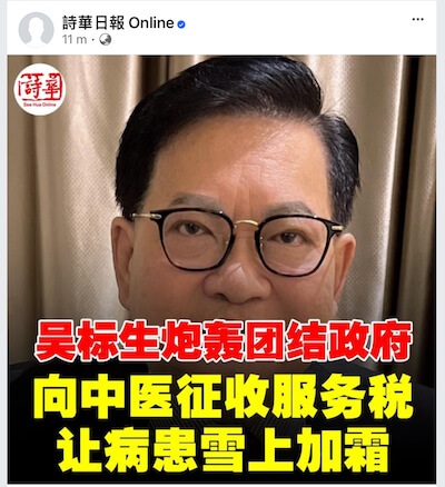 这是让人难以接受的事,也严重违反首相所提倡的“昌明大马”精神,因此,吴标生促请首相兼财长安华行使权力,马上废除向中医服务征税的荒谬政策并检讨税制重建税收架构,避免加重病黎或求诊者经济负担。
