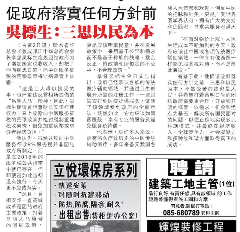 “在面对物价上涨,人民生活成本不断加剧的今天,政府应该让中医或各项传统医疗辅助领域,一律享有像西医一样豁免服务税对待,而不是厚此薄彼。”