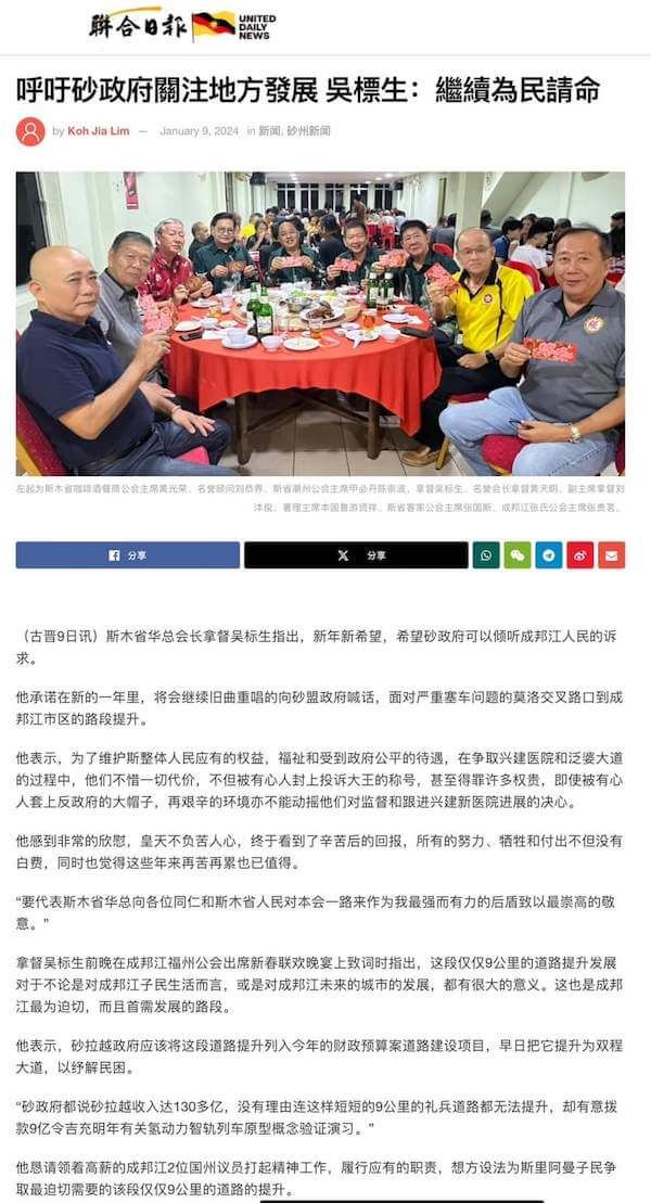 拿督吴标生前晚在成邦江福州公会出席新春联欢晚宴上致词时指出,这段仅仅9公里的道路提升发展对于不论是对成邦江子民生活而言,或是对成邦江未来的城市的发展,都有很大的意义。这也是成邦江最为迫切,而且首需发展的路段。