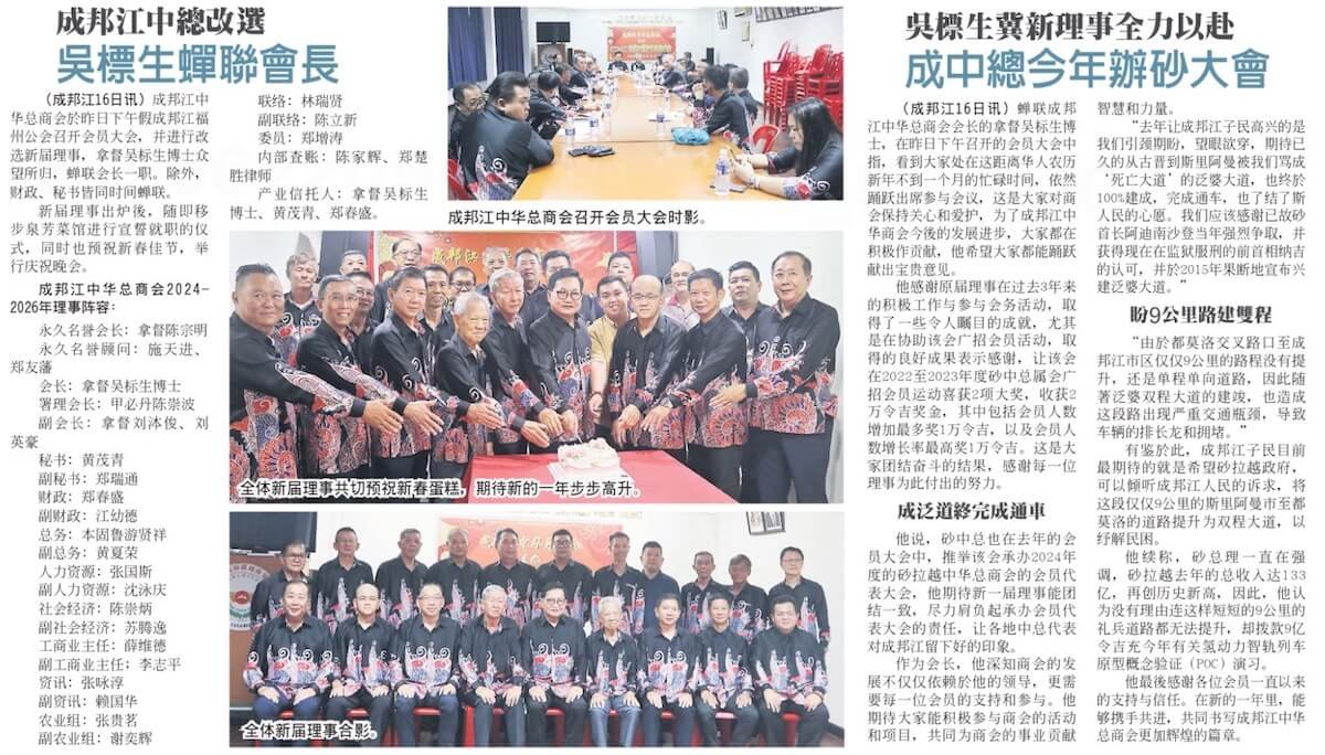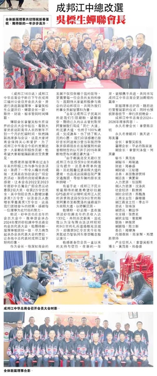 另外,砂中总也在去年的会员大会中,推举本会承办2024年度的砂拉越中华总商会的会员代表大会,我也期待新一届理事能团结一致,盡力肩付起承办会员代表大会的責任,让各地中总代表对我们成邦江留下好的印象。