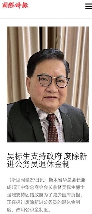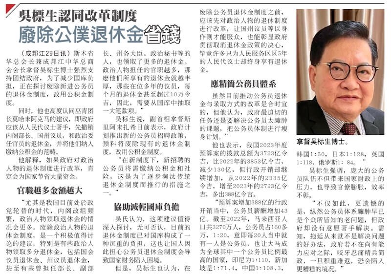 斯木省华总会长兼成邦江中华总商会会长拿督吴标生博士强烈支持团结政府为了减少国库负担,正在探讨废除新进公务员的退休金制度,改用公积金制度。