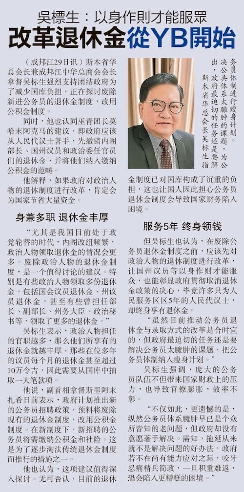 但是吴标生也认为在废除公务员退休金制度之前,应该先对政治人物的退休制度进行改革,让国州议员等以身作则才能服众,也能彰显政府贯彻取消退休金政策的决心,毕竟许多只为人民服务区区五年的人民代议士却终身享有退休金。