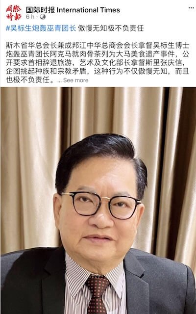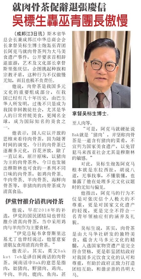 斯木省华总会长兼成邦江中华总商会会长拿督吴标生博士炮轰巫青团长阿克马就肉骨茶列为大马美食遗产事件,公开要求首相辞退旅游,艺术及文化部长拿督斯里张庆信,企图挑起种族和宗教矛盾,这种行为不仅傲慢无知,而且也极不负责任。