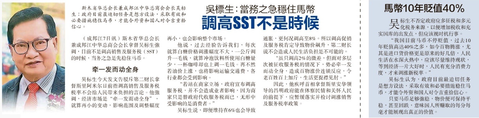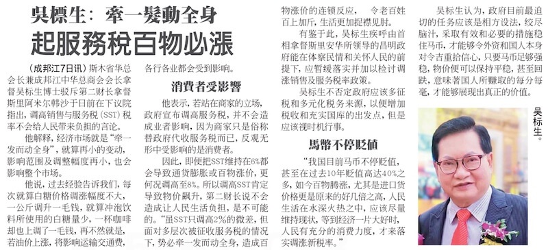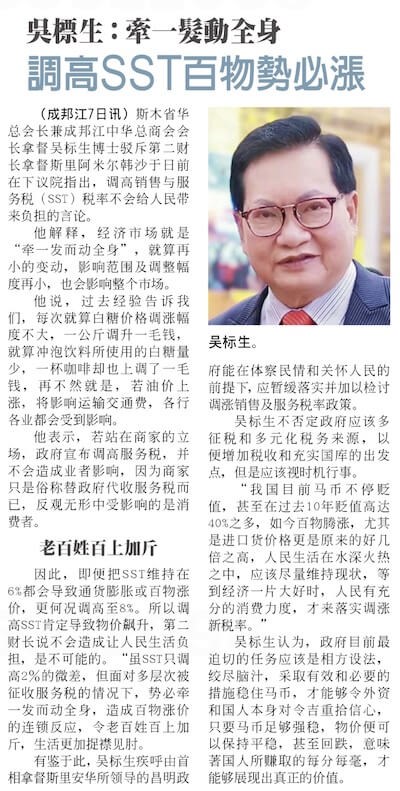 斯木省华总会长兼成邦江中华总商会会长拿督吴标生博士驳斥第二财长拿督斯里阿米尔韩沙于日前在下议院指出,调高销售与服务税(SST)税率不会给人民带来负担的言论。他解释,经济市场就是“牵一发而动全身”,就算再小的变动,影响范围及调整幅度再小,也会影响整个市场。