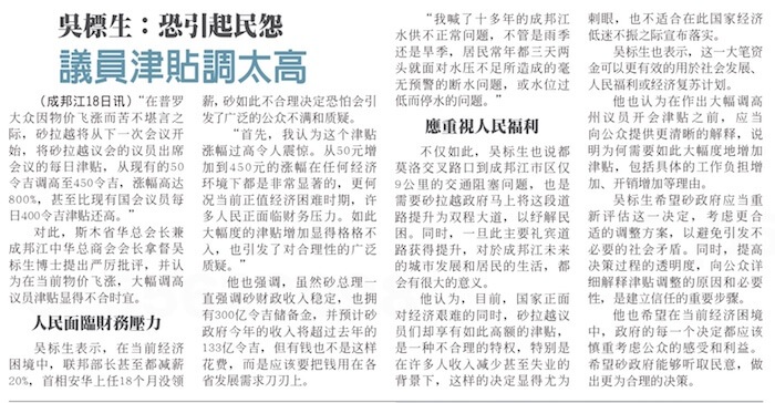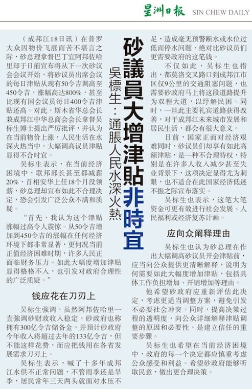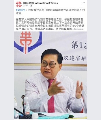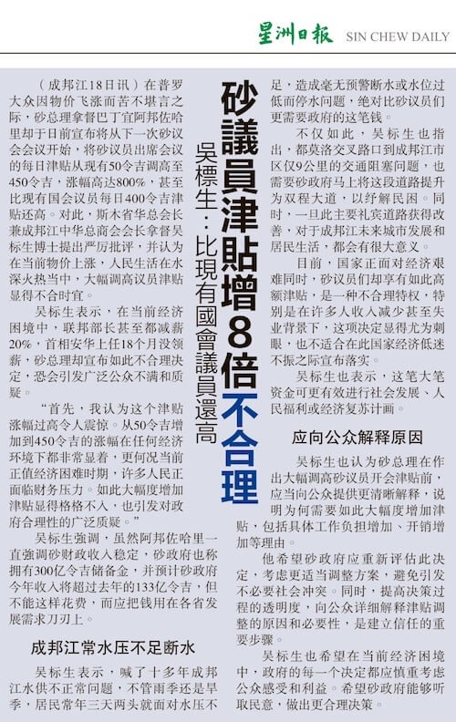 在普罗大众因物价飞涨而苦不堪言之际,砂拉越总理拿督巴丁宜阿邦佐哈里却于日前宣布将从下一次会议开始将砂拉越议会的议员出席会议的每日津贴将从现有的50令吉调高至450令吉,涨幅高达800%,甚至比现有国会议员每日400令吉津贴还高。对此,斯木省华总会长兼成邦江中华总商会会长拿督吴标生博士提出严厉批评,并认为在当前物價颷漲,人民生活在水深火熱當中,大幅调高议员津贴显得不合时宜。